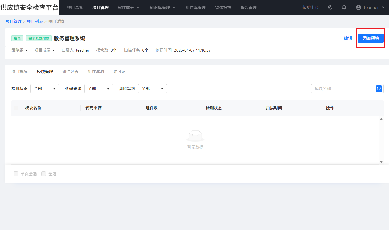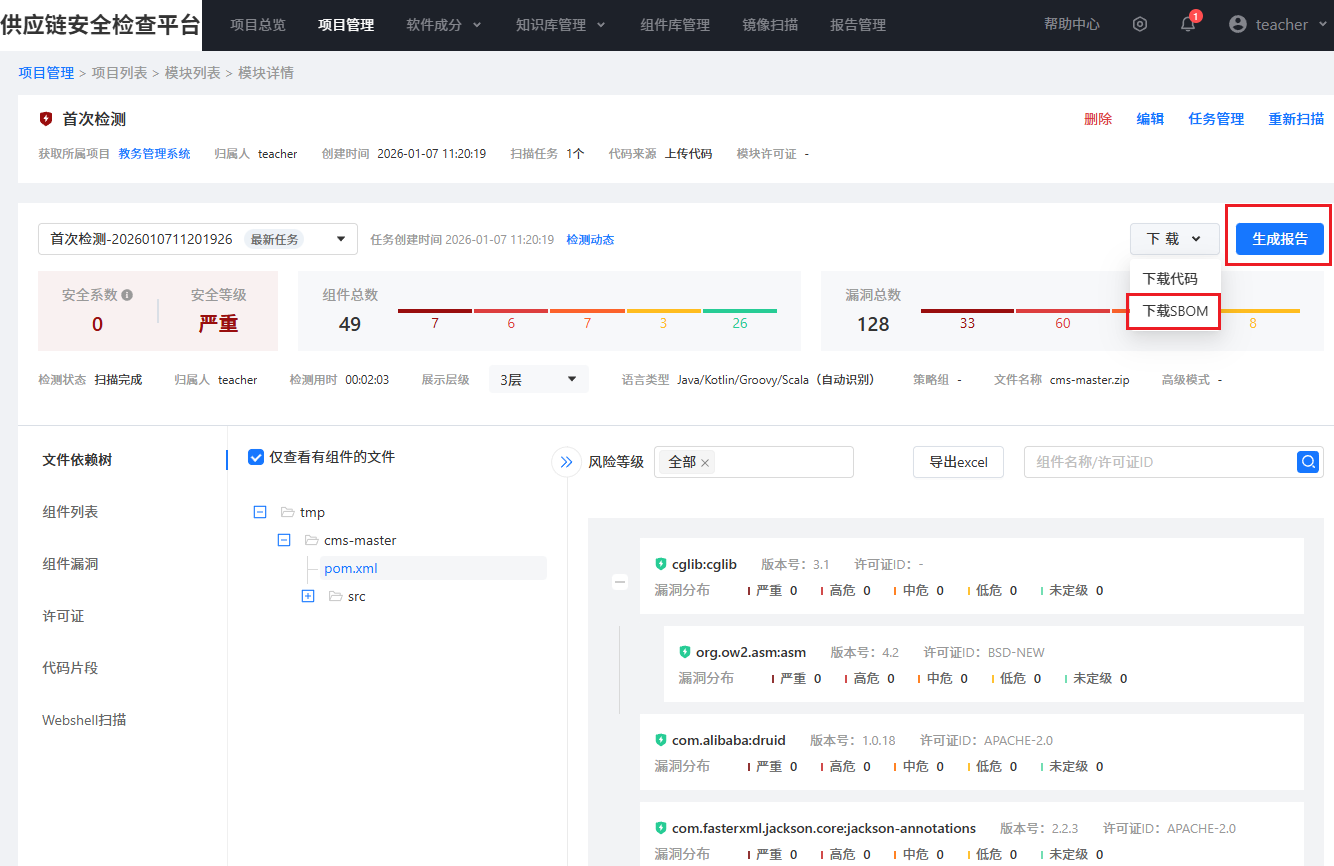 “供应链安全检查平台”为高校提供了一个便捷、高效的软件供应链风险自查与评估手段,及时掌握系统中存在的高风险组件和潜在供应链隐患,形成清晰的软件物料清单(SBOM)及整改建议,从源头上降低因软件供应链安全问题引发的网络安全事件,为业务系统安全稳定运行提供有力支撑。